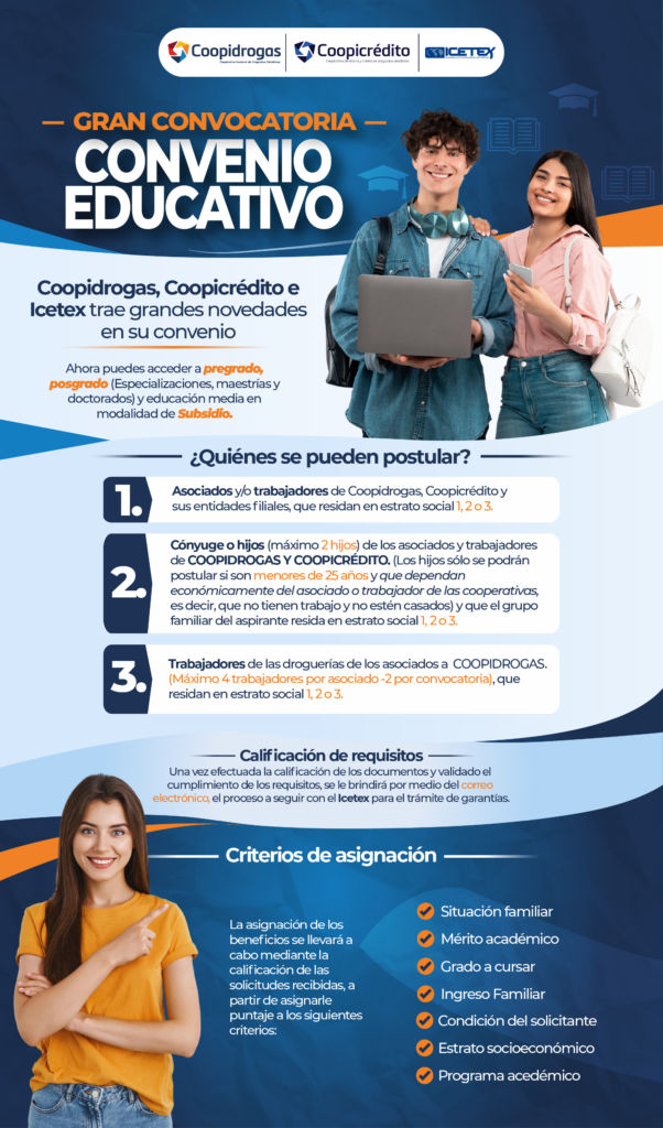 Este convenio está dirigido para los asociados afiliados a Coopidrogas, sus hijos menores de 25 años que dependan económicamente del asociado (máximo dos hijos), el cónyugue del asociado, los trabajadores de las droguerías afiliadas a la Cooperativa que tengan un año de labor en la droguería (máximo 4 trabajadores por asociado de los cuales se postulan dos por convocatoria) y los trabajadores de las Cooperativas y sus entidades filiales.