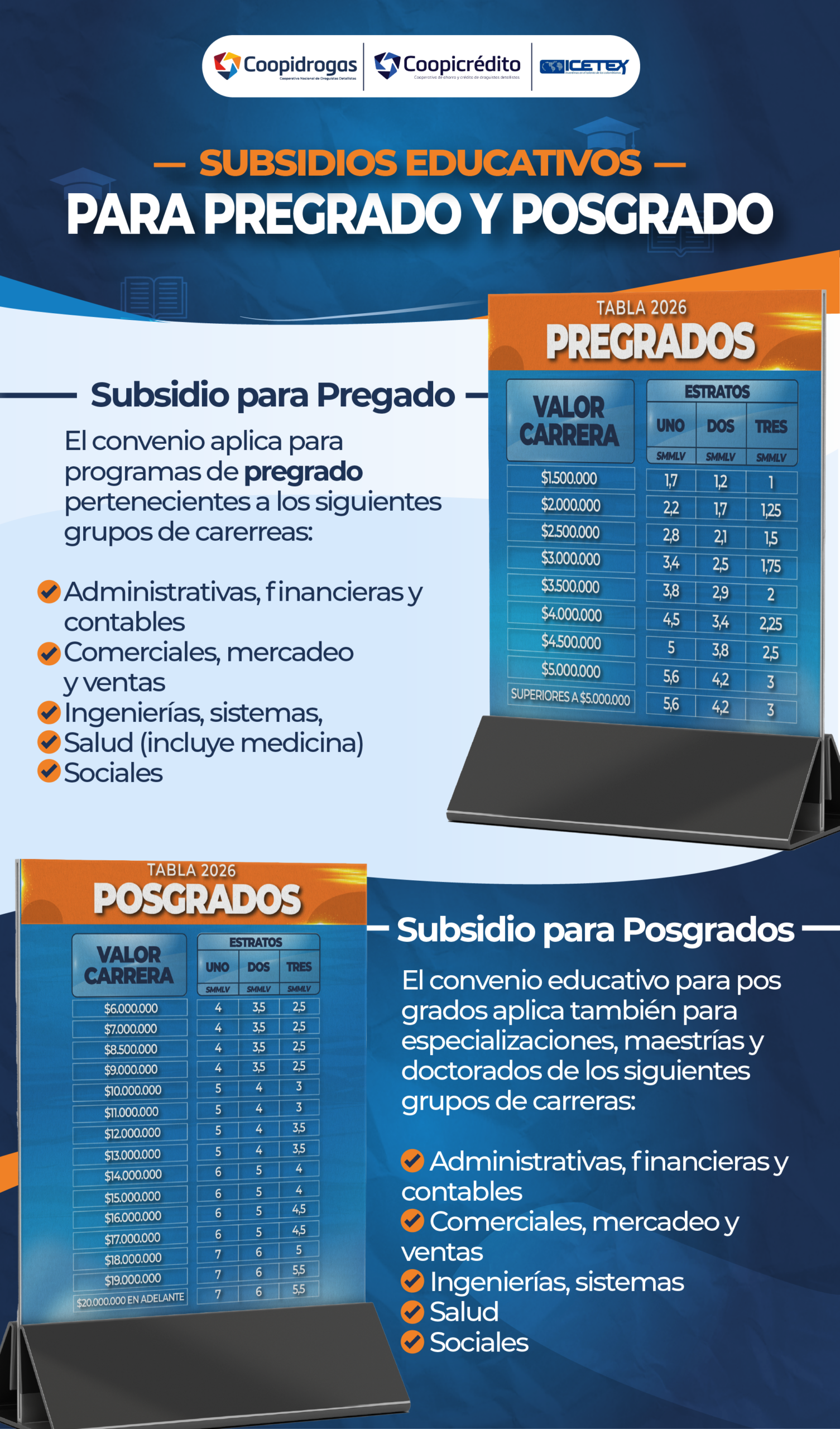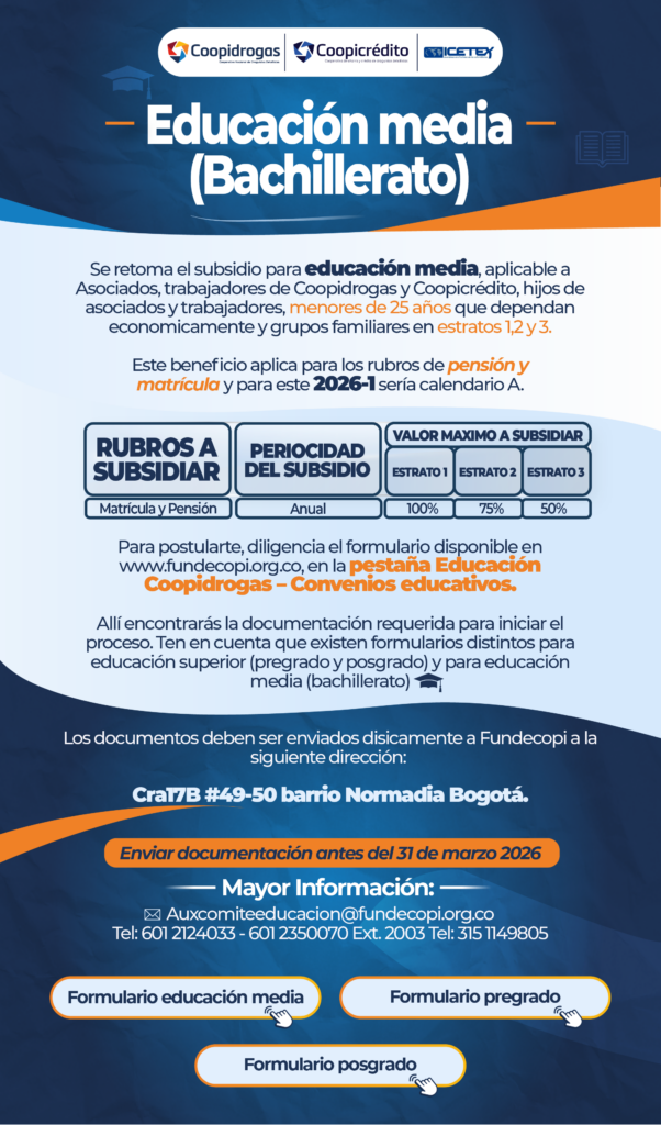 Que le permite acceder a los diferentes programas ofertados por la universidad como la Tecnología en Regencia de Farmacia, carreras profesionales, especializaciones y maestrías con diferentes descuentos. De este convenio se puede beneficiar toda la comunidad vinculada a Coopidrogas y sus filiales.